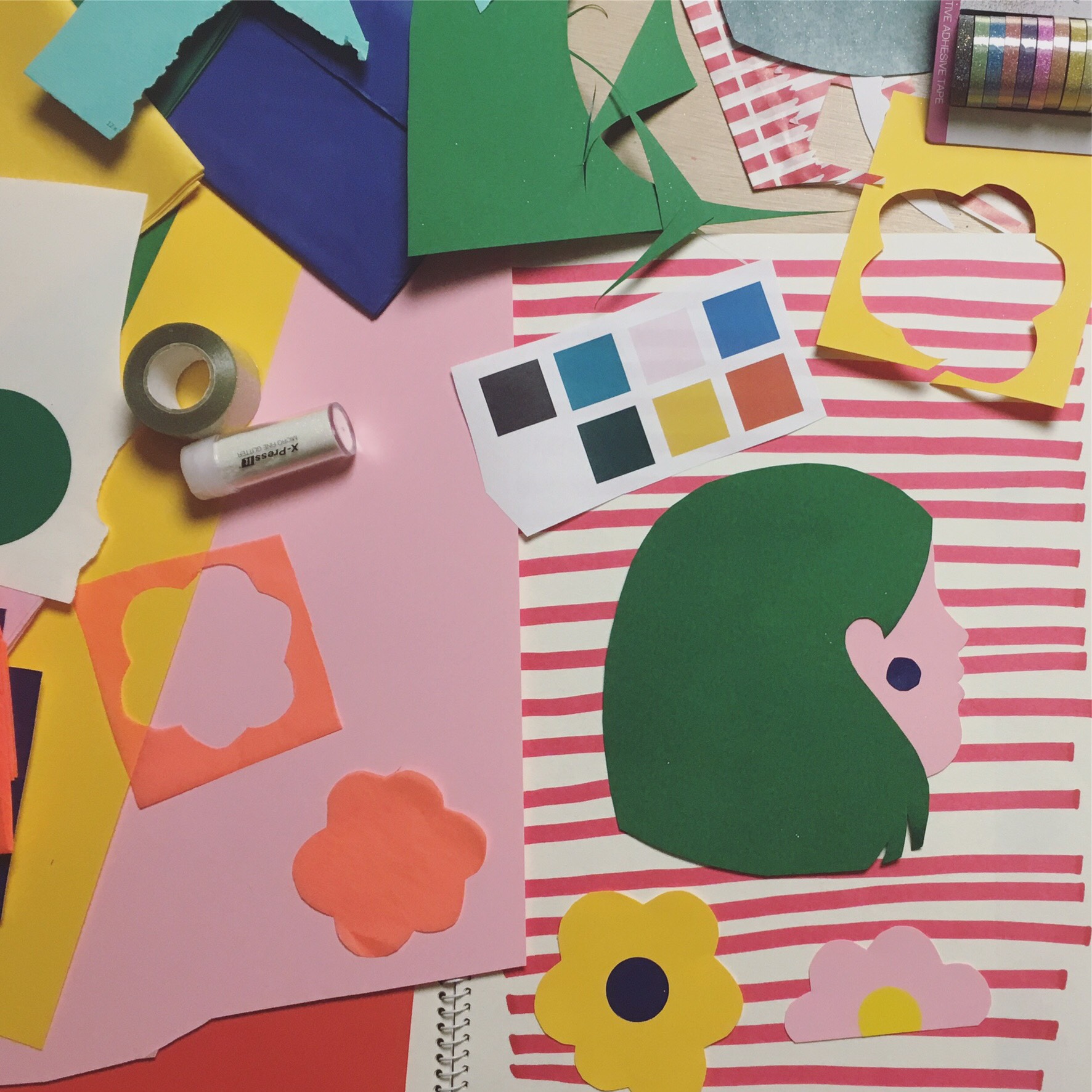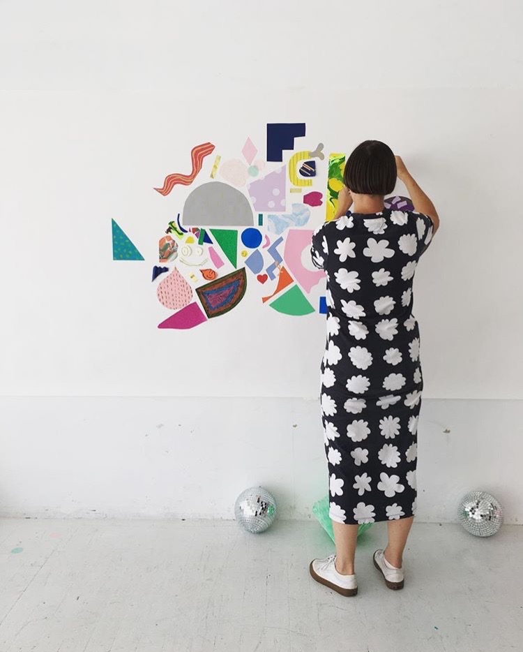 When I have all my pieces cut out, I don’t stick them down straight away, as I like to spend some time arranging and rearranging until I have a composition which I’m happy with. This can involve overlapping shapes, or spreading them further apart, looking at what colours look good next to each other. This is the most time-consuming part of making a collage for me - often I make a composition and leave it on my desk for a day, and see if I still like it when I look at it the next day.